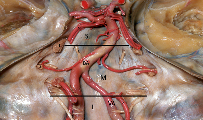 Figura 1: Al decidir el abordaje del clivus podemos dividir el clivus superior (S) (entre el proceso clinoideo posterior y la entrada del nervio trigémino), el clivus medio (M) (entre la entrada del nervio trigémino y el agujero yugular) y el clivus inferior (I) (debajo del agujero yugular). 1. nervio trigémino, 2. complejo vestíbulo coclear con arteria cerebelosa anteroinferior (AICA) 3. nervio abducens, 4. arteria cerebelosa superior 5. arteria cerebelosa postero inferior (PICA), arteria basilar (BA) y arteria vertebral (VA).