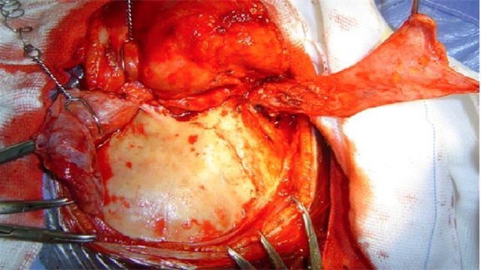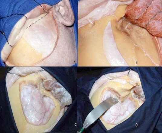 En el abordaje petroso posterior (supra- infratentorial pre-sigmoideo) el paciente se coloca en posición supina, con la cabeza girada hacia el lado opuesto. La incisión en la piel se realiza en forma semicircular desde la región temporal, cuatro centímetros por encima del arco cigomático, pasando tres centímetros detrás de la oreja, extendiéndose dos centímetros detrás de la punta del mastoides. Para evitar la pérdida postoperatoria del líquido cefalorraquídeo se utiliza la reconstrucción de la base del cráneo con la fascia muscular temporal que se secciona y se diseca con el periostio del mastoides, con la fascia craneocervical y el músculo esternocleidomastoideo, que se separa de su inserción, formando un gran colgajo vascularizado que se gira hacia atrás al final de la cirugía para cubrir todo el campo quirúrgico.Figura 8: Colgajo de fascia temporoparietal para cierre mastoideo.