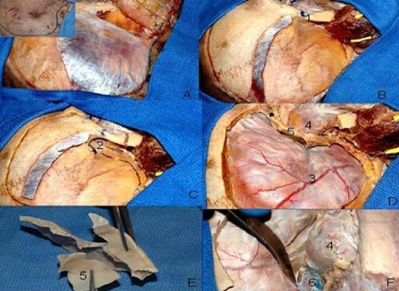 Figura 5: Abordaje cráneo-orbito-cigomático. La incisión se realiza 1 cm por debajo del trago y se extiende superiormente terminando en la línea temporal superior del lado contralateral (marco más pequeño en A). Disección subfascial (A). Se gana aproximadamente 1 cm de base temporal cuando refleja el músculo temporal inferiormente después de la cigomaticotomía (B). El agujero clave se realiza justo detrás de la sutura fronto-cigomática y expone la periórbita en su mitad anterior y la duramadre de la fosa anterior en su mitad posterior (C), ambos divididos por el techo de la órbita (2). La parte anterior del techo de la órbita se elimina junto con la craneotomía (D). La parte posterior del techo de la órbita se retira en una parte separada (D) y se usa para la reconstrucción (E). El pelar de la fosa media puede comenzar de anterior a posterior, exponiendo la pared lateral del seno cavernoso (F). 3. arteria meníngea media, 4. peri-órbita, 5. parte posterior del techo de la órbita, 6. seno cavernoso.