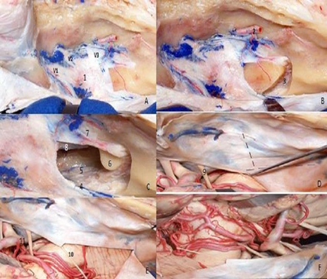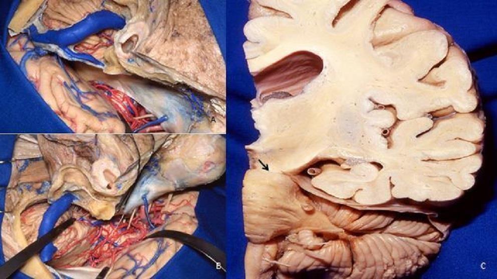 Se disecaron ocho cabezas de cadáveres utilizando un microscopio quirúrgico con un aumento de 3X a 40X. En los cerebros y en todas las cabezas se inyectó silicona de color para resaltar la diferencia entre las arterias y las venas. Los cadáveres se colocaron en un fijador de cráneo tipo Mayfield, con la cabeza extendida y girada, simulando el posicionamiento quirúrgico de los abordajes cráneo orbito-cigomático, petrosectomía anterior, posterior y retrosigmoideo.