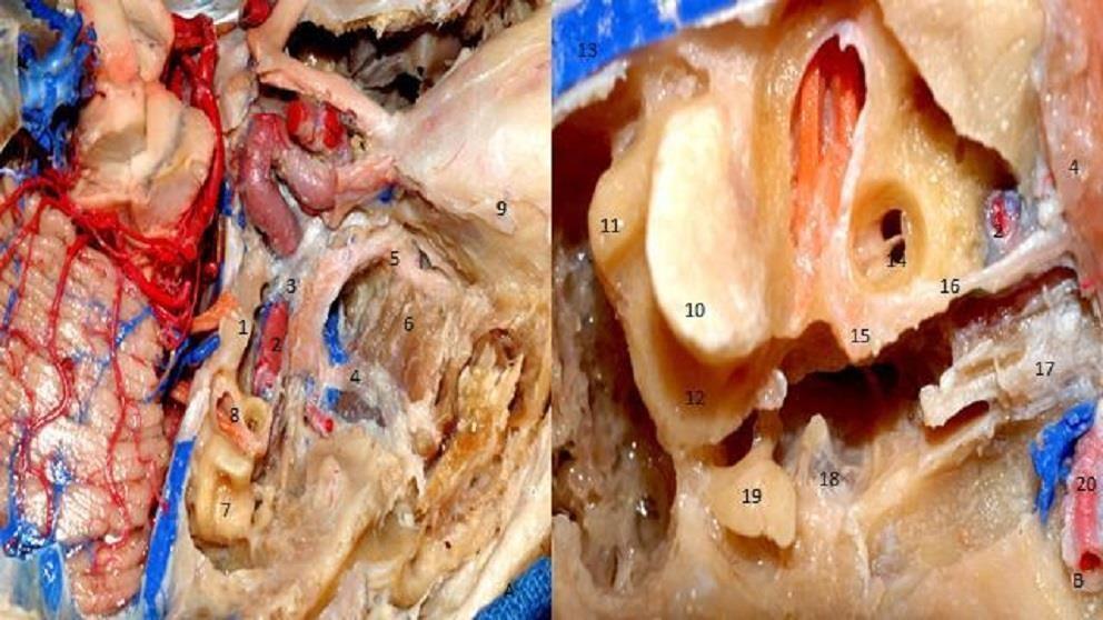 Figura 7: Vista general de la fosa media derecha después de una disección avanzada de estructuras óseas y nerviosas. Se retiró el ganglio de gasser para una mejor visualización del ligamento petro-lingual y la transición entre el segmento petroso y cavernoso de la arteria carótida interna. El límite posterior de la petrosectomía anterior es el segmento petroso de la arteria carótida interna (A). Vista aproximada de los límites disecados de la petrosectomía anterior (B). 1. ápex petroso, 2. porción intrapetrosa de la arteria carótida interna, 3. ligamento petrolingual, 4. V3, 5, V2, 6. cabeza superior del músculo pterigoideo lateral, 7. cápsula óptica con canales semicirculares, 8. canal auditivo interno, 9. periórbita, 10. canal semicircular superior, 11. canal semicircular posterior, 12. canal semicircular lateral, 13. seno petroso superior, 14. cóclea, 15. ganglio geniculado, 16. nervio petroso superficial principal, 17. músculo tensor timpánico, 18. membrana timpánica y martillo, 19. yunque, 20. arteria meníngea media.