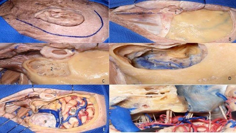 Figura 9: Abordaje petroso posterior o presigmoideo supra/infratentorial. Incisión en C extendida a la región cervical (A). El canal auditivo externo, aunque seccionado en esta imagen, no se debe seccionar durante la cirugía (B). El drenage de la corteza de la parte mastoidea del hueso temporal es el primer paso del abordaje (C). El seno sigmoideo y la duramadre pre-sigmoidea (triángulo de trautman) están expuestos. No es necesario esqueletizar el nervio facial o individualizar los canales semicirculares como se muestra en esta disección (D). La duramadre de la fosa posterior y media está expuesta (E). Exposición del corredor obtenida después de la coagulación del seno petroso superior y la incisión desde el tentorio hasta la cisterna ambiens, exponiendo las fosas posterior y media en el mismo abordaje. 1. cartílago y piel del canal auditivo externo seccionado, 2. corticectomía de la cavidad mastoidea, 3. seno sigmoideo, 4. duramadre pre-sigmoidea (triángulo de trautmann), 5. canales semicirculares, 6. nervio facial (parte mastoidea), 7. bulbo yugular, 8. seno transverso, 9. duramadre de la fosa posterior, 10. vena de Labbé, 11. nervios craneales bajos, 12. nervio facial, coclear y vestibular, 13. nervio trigémino y vena petrosa superior (Dandy), 14. nervio troclear, 15. nervio oculomotor.