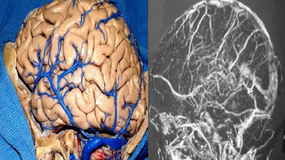 Figura 13: El estudio de la posición del drenaje de la vena anastomótica inferior (Labbé) se realiza para evaluar cuando se pretende realizar el abordaje petroso posterior. La vena de Labbé comúnmente drena en la unión de los senos transverso y sigmoideo (flecha). Pieza anatómica (A). Resonancia venosa (B).