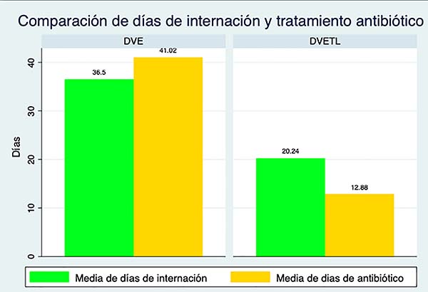 Gráfico 1: Comparación de la media de días de internación y de tratamiento antibiótico en el grupo de pacientes con DVE vs. DVETL.´