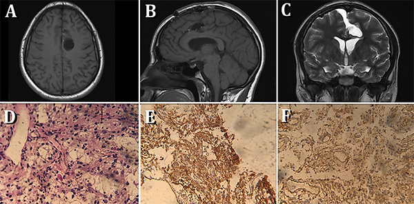 Figura 2: Imágenes post-operatorias. A, B) Secuencia T1 de resonancia magnética (RM) en plano axial y sagital respectivamente, donde se evidencia resección total del tumor. C) Secuencia T2 donde se observa huella de abordaje interhemisférico contralateral transfalcino y restitución de tamaño, forma y posición de ventrículo lateral y estructuras anatómicas adyacentes. D, E, F) Hallazgos histopatológicos. Cortes histológicos con tinción de eosina-hematoxilina en la cual se observa proliferación neoplásica constituida por elementos de núcleos esféricos y citoplasma claro cuya disposición es laxa y de baja densidad celular.