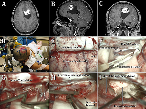 Imágenes intra-operatorias. D) Posicionamiento del paciente en decúbito supino con fijación en cabezal de Mayfield, con pines colocados en línea temporal superior y base mastoidea respectivamente. Elevación de la cabeza a 45 grados sobre el nivel del corazón, rotación y alineación del plano sagital paralelo al piso, dejando el lado de la lesión orientado hacia arriba. E) Vista superior de durotomía del lado izquierdo y retracción de duramadre sobre seno longitudinal superior, exponiéndose el giro frontal superior derecho. F) Disección interhemisférica que evidencia la hoz cerebral, el seno longitudinal inferior y el componente quístico de la lesión el cual se evacúa por punción-aspiración. G) Delicada retracción del hemisferio derecho para incisión curvilínea de hoz cerebral. H) Se observa ventana transfalcina que permite visualizar el giro frontal superior izquierdo y la resección de la lesión. I) Exposición del giro del cíngulo izquierdo y de la exéresis microscópicamente completa del tumor.