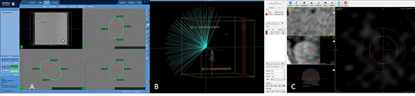 Figura 2: A) muestra los diferentes gradientes de dosis de Cyberknife en una esfera de 4 mm promediando 1.66. B) Muestra una configuración de un plan isocéntrico de Cyberknife. C) Muestra el plan comparativo de Infini utilizando el colimador de 4mm en el cual el gradiente de dosis promedia 1.5 mm.