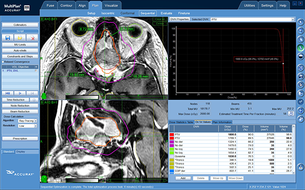 El paciente atiende al proceso de simulación, el cual consiste en configurar una máscara termoplástica que ayudará a limitar el movimiento de la cabeza durante el tratamiento, se adquiere un TAC sin contraste o con contraste cuando se es necesario de la totalidad de la cabeza incluyendo hasta la segunda o tercera vértebra cervical abarcando la totalidad de la mandíbula. Posteriormente, se adquieren las secuencias necesarias de resonancia magnética 1.5 Tesla (General Electric, Massachusetts, USA) en secuencias de T1 MPR Gadolinio y T2 FIESTA que es el equivalente al CISS cuando se es necesario, el paciente es dado de alta del centro de imágenes y convocado para tratamiento usualmente en 48 a 72 horas después. Las imágenes son transferidas a la consola de MultiPlan™ (Accuray, Sunnyvale California), y son fusionadas, la lesión o target (GTV Gross Tumor Volume) es contorneado al igual que todas las estructuras en riesgo que involucran cerebro, tronco encefálico, ojos, vía óptica y paladar duro para evitar haces de radiación entrando por la boca. Utilizando la modalidad de 6D Skull para tracking se efectúa el cálculo de dosis de forma inversa -Inverse Planning-.