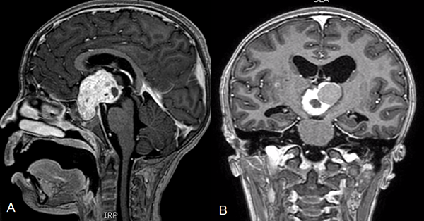 Figura 1. Resonancia magnética de cerebro con contraste. A y B. Corte sagital y coronal respectivamente donde se observa tumor sólido quístico en la región selar supraselar compatible con craneofaringioma.