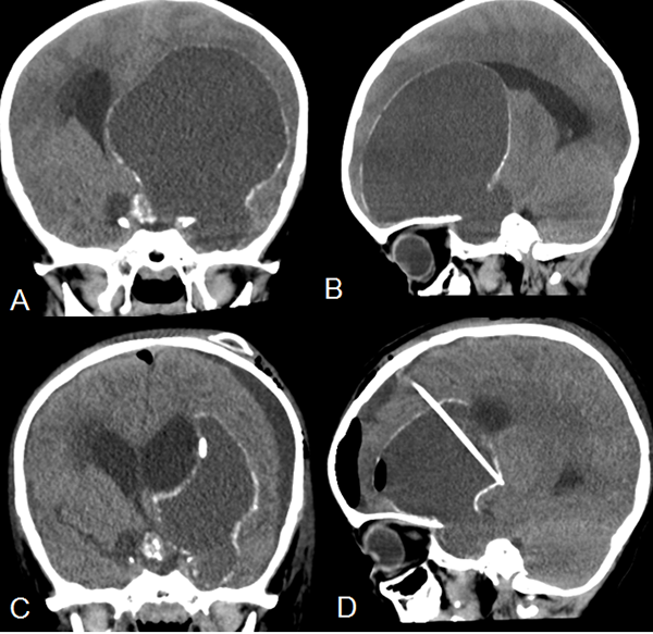 Figura 2. Tomografía cerebral simple. A y B. Cortes coronal y sagital donde se observa un tumor predominantemente quístico con cápsula parcialmente calcificada. C y D. Cortes coronal y sagital postoperatorio con catéter colocado dentro del quiste tumoral para reducción progresiva del volumen del mismo. Se observa reservorio a nivel subgaleal.