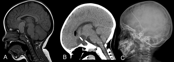Figura 3. A. Resonancia cerebro corte sagital donde se observa tumor a predominio quístico en la región selar supraselar compatible con craneofaringioma. B. Tomografía de cerebro corte sagital postoperatoria de colocación de catéter intraquístico. C. Radiografía cráneo perfil donde se observa catéter radiopaco con extremo en la región selar.