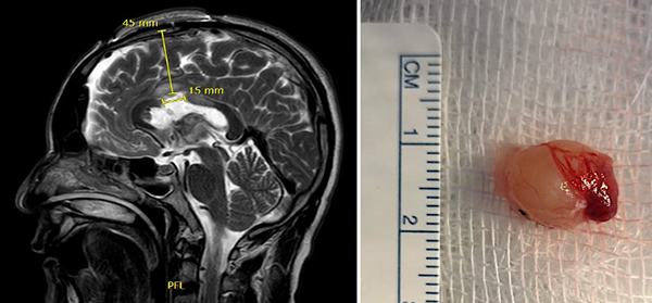 Figura 2. (A) IRM T2W sagital postoperatoria muestra la ruta de aproximación y longitud de la callosotomía; (B) Imagen de pieza quirúrgica mostrando su exéresis total.