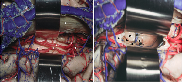 Figura 4. Anatomía quirúrgica de la cisura interhemisférica (A) y posterior a callosotomía (B): seno sagital superior (1); hoz del cerebro (2); circunvolución del cíngulo (3); cuerpo calloso (4); arteria pericallosa (5) y callosomarginal (6); arteria cerebral anterior (7); foramen de Monro (8); pilar del fórnix (9); vena talamoestriada (10); vena coroidea (11); plexo coroideo (12); tálamo (13). Adaptado de: The Rhoton Collection®33
