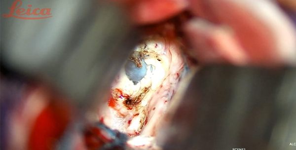 Se procede con la microdisección circunferencial del quiste bajo visión directa, en última instancia en sentido posterior separándolo del plexo coroideo y demás estructuras neurovasculares a lo largo del techo del tercer ventrículo, logrando su exéresis en bloque. La apertura del quiste y succión de su contenido es favorable para la descompresión y movilización de la cápsula con un microdisector para, finalmente, con pinza de biopsia realizar la exéresis en bloque. Debe prevenirse la manipulación del fornix y cuidar que la succión no dañe las estructuras circundantes. Las cavidades ventriculares se irrigan evacuando cualquier residuo. Una vez alcanzada la hemostasia, la duramadre se cierra de forma hermética y se sutura por planos según técnica habitual. Puede ser necesario dejar un catéter ventricular el cual será retirado en el período postoperatorio. En el presente caso se mantuvo por 72 horas.
