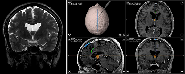 Figura 1. (A) IRM T2W coronal: ubicación anatómica de la lesión en foramen interventricular; (B) IRM integrada al sistema de neuronavegación, planeación de abordaje quirúrgico.