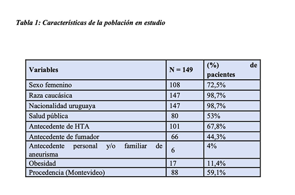 En el período de estudio descripto en este trabajo (primeros 8 meses del estudio original) fueron incluidos un total de 151 pacientes. De esos 151, 2 casos fueron excluidos por tener un estudio vascular negativo para aneurisma. Es así, que el total de pacientes analizados fue de 149.