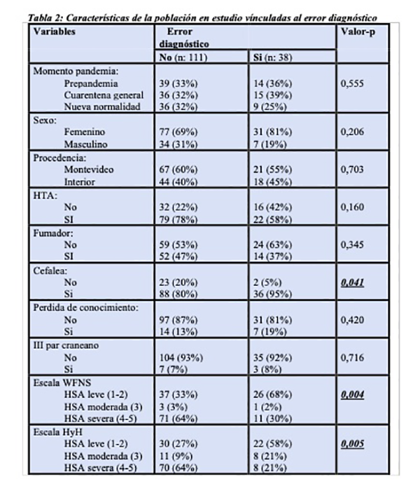 Conclusions: in the present work, a high diagnostic error was observed, showing a significant direct relationship with headache and mild SAH (HyH 1 and 2) as forms of presentation. There was a higher percentage of severe SAH compared to the literature, with a direct and significant relationship between the presence of vasospasm and mortality with diagnostic error. It is also clear that the health crisis determined that this diagnostic error increased during the first months of the pandemic in Uruguay.