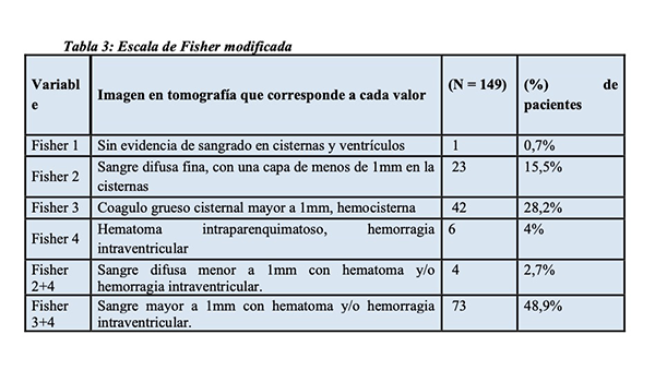 En cuanto a la imagen, se evaluó según la escala de Fisher modificada (Tabla 3), evidenciándose además la presencia de hidrocefalia (HCF) inicial tomográfica en un 36,2%.