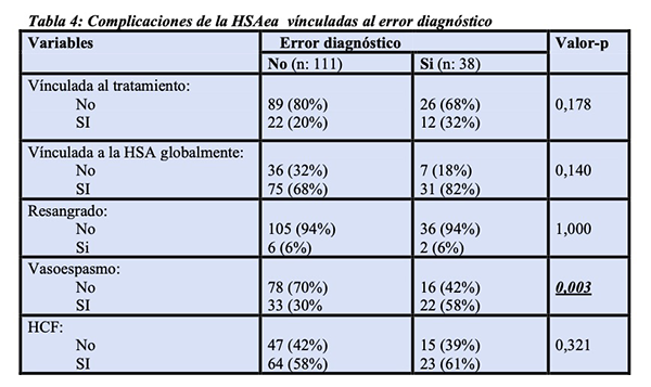 Tabla 4: Complicaciones de la HSAea vinculadas al error diagnóstico.