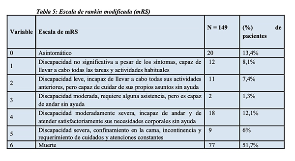 Finalmente, al alta se valoró la evolución de los pacientes utilizando la escala de rankin modificada (mRS) que se describe en la siguiente (Tabla 5).