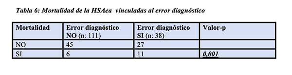 Tabla 6: Mortalidad de la HSAea vinculadas al error diagnóstico.