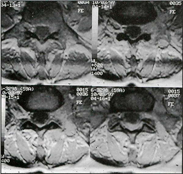 En cada caso la incisión de piel se efectuó a 3 cm de la línea media sobre el nivel apropiado, ubicado con radiografías intraoperatorias. Luego de abrir la fascia toracolumbar se individualizó el hiato existente entre los músculos longissimus y multifidus, profundizando la disección. Al llegar al espacio intertransverso en los casos 1 y 3 se colocó el microscopio y se continuó la cirugía con técnicas microquirúrgicas. En el caso 1 se abrió el músculo y la fascia intertransversa. Luego se individualizó la raíz y antes de liberarla se tomaron muestras del tejido circundante. Se completó el procedimiento aspirando el tejido que rodeaba la raíz dejándola libre y móvil. En el caso 2 se disecó la megatransversa de los tejidos blandos y se la resecó cortando con un torno su base de implantación en el pedículo.