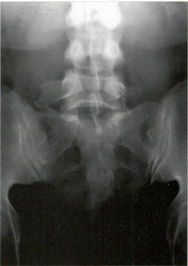 Flg. 5. Rx simple postoperatoria que muestra la falta de la megapófisis transversa de L5.
