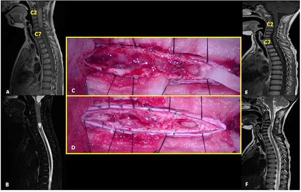 Paciente sexo femenino de 17 años con antecedente de trastornos de la conducta alimentaria que consulta por disestesias en palmas y plantas de un año de evolución, que progresa con debilidad en miembro superior izquierdo. Al examen físico se evidencia paresia leve braquial izquierda. La RM mostró dos lesiones focales hiperintensas en T2, localizadas en el cordón posterior derecho, que comprometen los niveles C2 y C3-C4 que no presentan realce tras la administración de contraste. Se realizó exéresis completa de lesión inferior y subtotal de la superior. El monitoreo neurofisiológico intraoperatorio no evidenció alteraciones significativas en los potenciales motores. En el postoperatorio inmediato la paciente recuperó la paresia del MSI. La RM control confirma remanente tumoral a nivel de C2 y resección total de la lesión C3-C4. La anatomía patológica informó astrocitoma pilocítico (Grado I de la OMS). La paciente evolucionó con inestabilidad cervical y cifosis progresiva requiriendo artrodesis cervical anterior (C3-C5) a los 7 meses de la cirugía (Figura 3).