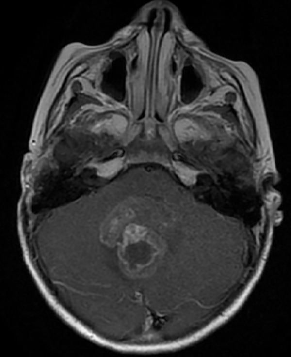 Fig 1: RM corte axial, secuencia T1 con contraste. Se observa neoformación medial, solido-quística, heterogénea de bordes irregulares en la topografía del VI ventrículo que ocupa la totalidad del mismo, que realza en forma heterogénea tras la administración del contraste.