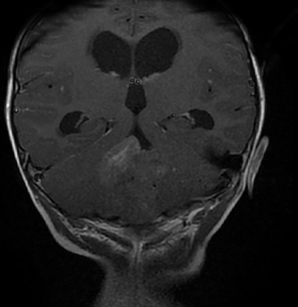 Fig 3: RM corte coronal, secuencia T1 con contraste. Se observa neoformación medial, solido-quística, heterogénea de bordes irregulares en la topografía del VI ventrículo que ocupa la totalidad del mismo, que realza en forma heterogénea tras la administración del contraste. Se observa dilatación triventricular