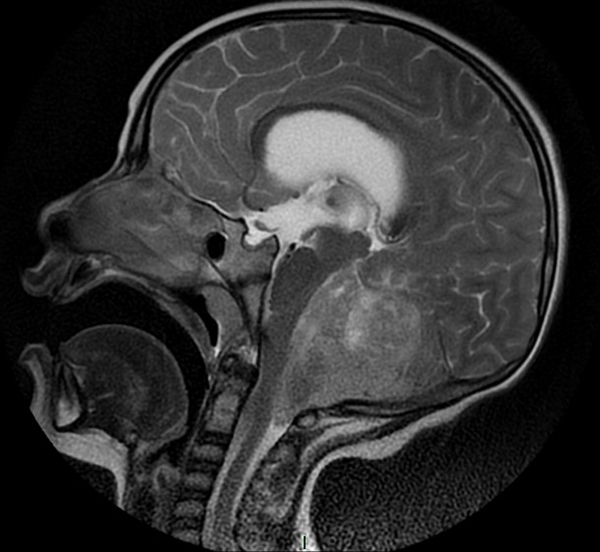 Fig 2: RM corte sagital, secuencia T1 con contraste. Se observa neoformación medial, solido-quística, heterogénea de bordes irregulares en la topografía del VI ventrículo que ocupa la totalidad del mismo, que realza en forma heterogénea tras la administración del contraste y se proyecta caudalmente a través del foramen magno. Se evidencia colapso del VI ventrículo, desplazamiento del tronco cerebral hacia anterior y abombamiento del cuerpo calloso debido a la hidrocefalia obstructiva.
