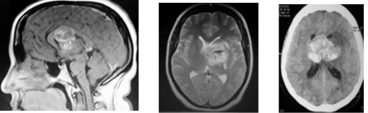 Figura 1. A: RMN secuencia T1 corte sagital donde se observó una lesión lobulada heterogénea con áreas hiperintensas comprometiendo cuerpo calloso y tercer ventrículo. B: RMN secuencia T2 corte axial donde se evidencia compromiso de ganglios de la base, cápsula interna y sistema ventricular. C: TAC encéfalo sin contraste corte axial donde se evidenció lesión de voluminoso tamaño mayoritariamente hiperdensa, con compromiso de morfología ventricular y ausencia de hemoventrículo.