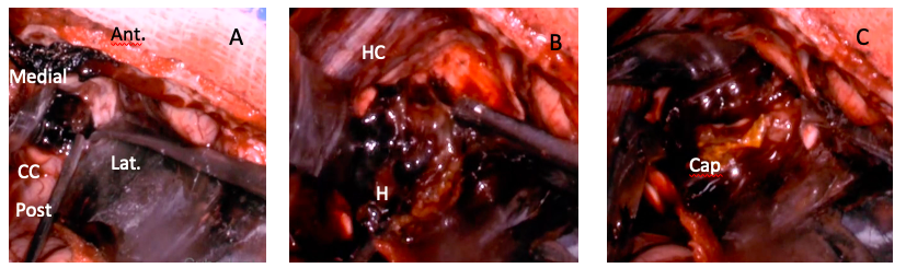 Figura 2: Imágenes intraoperatorias de la exéresis de la lesión. A: callosotomía luego de la cual se evidenció el coágulo sanguíneo. B: Exéresis del cavernoma de a porciones desde el interior de la lesión C: Se evacuó el hematoma en su totalidad y posteriormente se observó la cápsula verdosa la cual también fue resecada. Ant: anterior, Lat: lateral, Post: posterior, CC: cuerpo calloso, HC: hoz del cerebro, H: hematoma, Cap: cápsula.