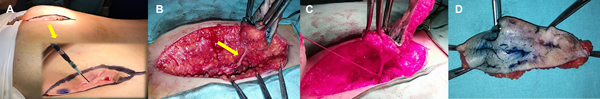Figura 3. a) Imagen intraoperatoria que muestra incisión tipo losange en línea media, incluyendo los orificios cutáneos previamente marcados con azul de metileno (flecha amarilla). b) Vista lateral derecha donde se aprecia el seno dérmico sacrocoxígeo con una dirección descendente. c) Se liga con lino la base del trayecto fistuloso y se secciona. d) Pieza quirúrgica completa que se envía patología e informa quiste pilonidal.
