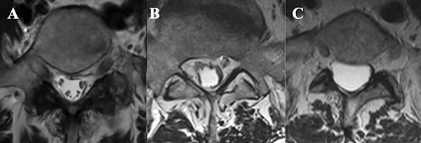 Figura 5: Cortes axiales de RMN en secuencia T2. A- Canal medular de configuración habitual a nivel lumbosacro; B y C- Signo del “saco tecal vacío”: patrón visualizado en RMN caracterizado por adherencia de raíces nerviosas en la periferia de las menínges.