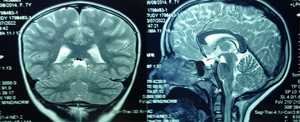 Figura 1: Caso ejemplo: paciente de 7 años. Derivada por cefaleas y disminución de la agudeza visual (corregida con anteojos). Seguimiento de dos años sin variantes en la IRM.