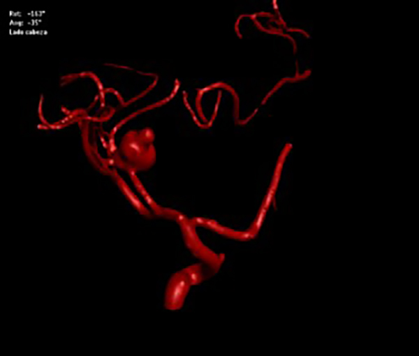 Caso clínico: Paciente masculino de trece años de edad presenta cuadro de 24 horas de evolución caracterizado por cefalea y vómitos en varias oportunidades, agregando convulsiones tónico-clónicas con ictus prolongado, se realizó tomografía cerebral (TAC) que evidenció hemorragia subaracnoidea (HSA) y una masa ocupante, probablemente un aneurisma de la arteria cerebral posterior derecha. La angiografía cerebral digital evidenció un aneurisma disecante de 2 centímetros del sistema vertebro basilar a nivel de la unión de los segmentos P2/P3 de la arteria cerebral posterior derecha. Se optó por la resolución endovascular y oclusión de la arteria portadora con coils y material embolizante.