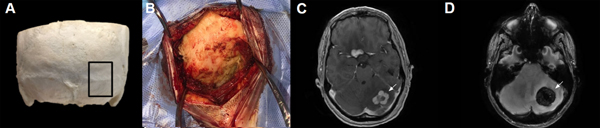 Figura 1. A. Se señala en un cráneo la región anatómica donde se centra el ASOPM, evidenciando la falta de reparos óseos. B. Imagen quirúrgica de un ASOPM donde se puede ver la falta de referencias anatómicas constantes. C. RMN con contraste EV donde se puede ver una LOE tumoral en el sector medio del hemisferio cerebeloso izquierdo. D. RMN que evidencia una lesión vascular (cavernoma) ubicado en el tercio medio del hemisferio cerebeloso izquierdo.