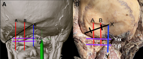 Se trazó una línea entre el Inion y la punta de la mastoides (línea X), que dividimos en tres tercios. Se buscó una correlación entre el sV3-AV y el tercio medio de dicha línea. Se consideró que la arteria estaba dentro del tercio medio de dicha línea si estaba presente en un porcentaje mayor o igual al 70%.