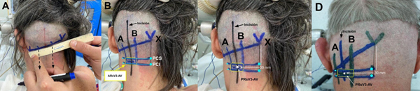 Figura 3. Marcación de reparos con el paciente en posición quirúrgica. A. Trazado de la línea X la cual se dividió en tres tercios, delimitados con un punto. Por cada uno de los puntos se trazó una línea en el plano vertical, proyectándolas hacia la UCC (líneas negras punteadas). B. Marcación de los PCS (20 mm) y PCI (40 mm). A partir de esos puntos, se trazaron dos líneas en el plano horizontal con dirección lateral hacia el tercio medio de la línea inion-mastoides (flechas celestes). De esta manera quedó delimitada el área de riesgo de la arteria vertebral (ARsV3-AV) en la líneas A y B, y los PCS y PCI. C y D. Planificación de la incisión, constituida por una línea vertical entre las líneas A y B, y marcación del punto de riesgo de la arteria vertebral (PRsV3-AV).