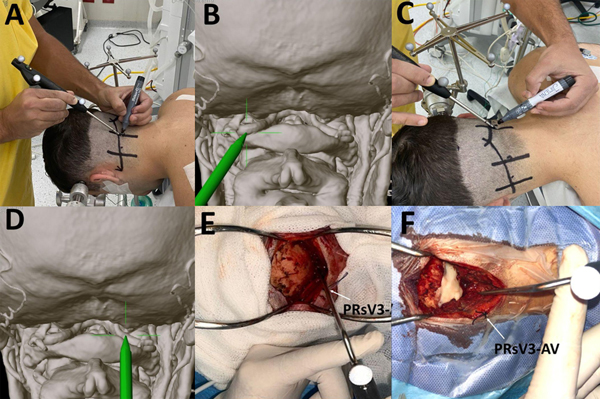 Figura 4. A-D. Marcación del sV3-AV en el tercio medio de la línea inion mastoides en un paciente en posición quirúrgica, y su respectiva correlación con el sistema de neuronavegación. E-F. Imagenes intraquirúrgicas que señalan el PRsV3-AV con un punto de Vycril 2.0 en el plano cutáneo, usado como referencia para ubicar el sV3-AV en la disección hacia planos profundos. Con el pointer del neuronavegador, se corroboró la concordancia del PRsV3-AV con el sV3-AV en el plano de la UCC.