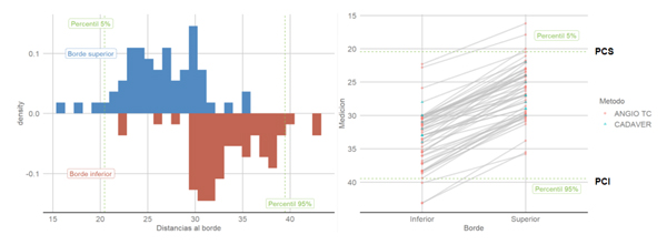 Figura 5. Gráficos señalando la distribución de los PCS y PCI en la población estudiada por Angio TC y disecciones cadavéricas.