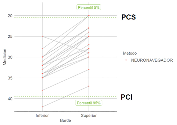 Mediante estas últimas mediciones se definió como punto de corte, el percentilo 5% para el borde superior (punto de corte superior o PCS) y el percentil 95% para el borde inferior (punto de corte inferior o PCI) con el afán de capturar el 90% de los casos.