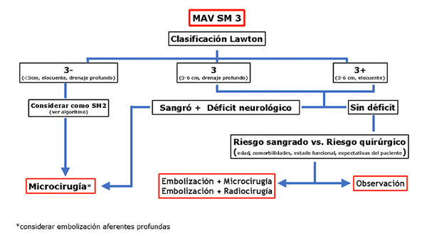 De esta forma, consideramos que las MAVs 3- se comportan como un grado II de SM, y las 3 y 3+ como un grado IV. Por ende, solemos indicar la cirugía para aquellas lesiones clasificadas en 3-, eligiendo observar las 3 y 3+. En caso de que el paciente presente un déficit neurológico progresivo por fenómeno de robo vascular o hemorragias a repetición se considerará tratarlas.
