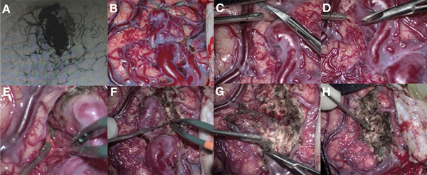 Figura 3: Caso quirúrgico ilustrativo: Exéresis microquirúrgica de MAV cortical localizada a nivel frontal izquierdo Grado II de la clasificación de Spetzler-Martin. A) Angiografía digital que evidencia nido malformativo cortical. B) Exposición de la malformación. Se observa importante de vena de drenaje con sangre arterializada. Vasos espiralados perimalformativos corticales. En el extremo superior se evidencian dos aferencias previamente embolizadas. C) Se comienza con la disección circunferencial de la MAV, removiendo la aracnoides e identificando los componentes: aferencias, eferencias y nido. D) Se continúa con la disección de la malformación a través del surco frontal superior. E) Profundización de la disección aracnoidea en el surco frontal exponiendo la cara lateral de la malformación. F) Disección circunferencial de la MAV, en esta imagen de la cara medial del nido utilizando la coagulación bipolar y manteniendo un campo quirúrgico limpio. Cada pequeño sangrado que se presenta se coagula rápidamente. G) Tras haber sido rodeada en forma completa, se aprecia el cambio de coloración de la vena de drenaje, sugiriendo que la malformación ya no posee aportes arteriales. Se coagula y secciona la vena de drenaje. H) Imagen final del lecho quirúrgico una vez resecada la totalidad de la MAV.
