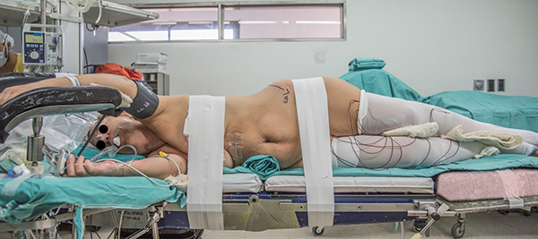 Se sugiere utilizar monitoreo neurofisiológico (electromiograma continuo, gatillado y estimulación radicular selectiva), debido a lo cual el método anestésico utilizado es anestesia total endovenosa. El paciente es posicionado en decúbito lateral derecho, con la mesa quirúrgica en posición neutra (Figura 3). Las piernas en extensión permiten tensar el músculo psoas, lo que genera su retracción y aumento del corredor de trabajo.7 Antes de comenzar se debe verificar con radioscopía una proyección lateral y anteroposterior estrictas, con platillos vertebrales paralelos en el nivel a tratar. Esto asegura que no haya alteraciones rotacionales que puedan llevar a mal posicionamiento de implantes o violaciones contralaterales. Se identifica el disco en la proyección lateral y luego se proyecta dicho espacio hacia la zona de la incisión en la región anterolateral del abdomen. El cirujano se coloca enfrente del abdomen del paciente, posicionando el equipo de radioscopía, el brazo del separador y el ayudante en el sector opuesto (a espaldas del paciente) (Figura 4d).