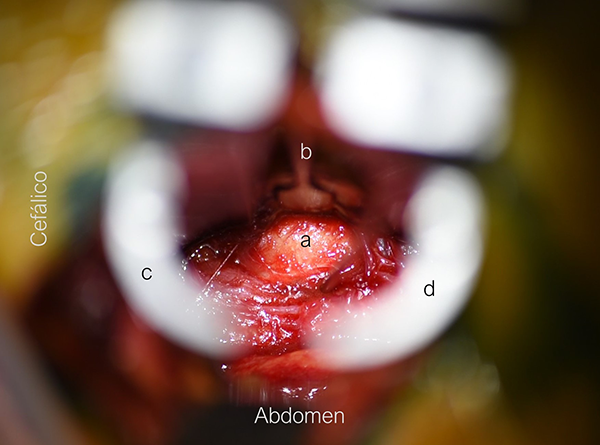 Figura 5: Imagen intraoperatoria con la colocación final de los separadores. a) Disco intervertebral. b) separador manual con retracción del psoas. c y d) Valvas cefálica y caudal respectivamente.
