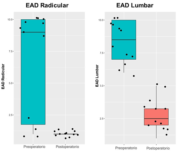 Gráfico 1: Box-plot demostrando la diferencia entre dolor radicular y lumbar pre y postoperatorio. En ambos casos, la diferencia fue significativa, con una clara disminución del dolor.