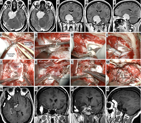 Figura 11. Caso ilustrativo #9. A-D. Imagen por RMN que muestran MRPC con implantación petroclival, extensión a la fosa craneal media y clinoides anterior. F-L. Se realizo un abordaje combinado con clinoidectomia anterior extradural y petrosectomia anterior. N-Q. Se consiguió una resección casi total. Imágenes postquirúrgica por RMN.
