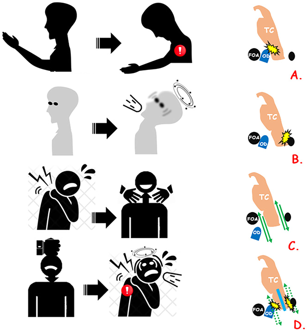 Fig. 2: Maniobras provocadoras de la unión cráneo-cervical. 2A: Flexión forzada de la cabeza imitando la maniobra de Lhermitte (Lhermitte modificado para la UCC); con IAA produce síndrome piramidal por compresión de la columna anterior por las apófisis odontoides. Fig 2B: Extensión forzada de la cabeza imitando la maniobra de Spurling (Spurling modificado para la UCC); con IAA produce síndrome cordonal posterior y vertiginoso por compresión con los elementos posteriores de la fusión atlanto-occipital. Fig. 2C: La distracción axial de la cabeza con IAA produce mejoría de la sintomatología aumentando el flujo del LCR en la UCC y liberando el tronco de la compresión. Fig. 2D: La compresión axial sobre la cabeza con IAA desencadena la sintomatología, disminuyendo el flujo del LCR en la UCC y regresando la compresión en el tronco. (Realizado por: autor JMAI).